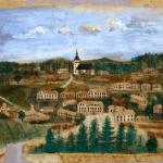 Text i nederkant: "Rita[d af] ……..C J Vester" "Utsigt af Kisa Kyrkoby och Marknadsplats i Ögt. Från Södra Sidan"