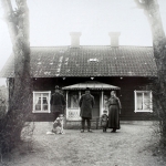 På målningen syns fr.v. ett sädesmagasin, ladugården och bostadshuset. Flaggstången har årtalet 1911. Idag är gården tillbyggd med en ny flygelbyggnad. Tillhörande fotografi är taget vid gården 1932 och personerna är fr.v.: fadern Henning, farfadern Johan Fredrik, ägaren, farmodern Anna Carolina Andersson samt hunden Key.