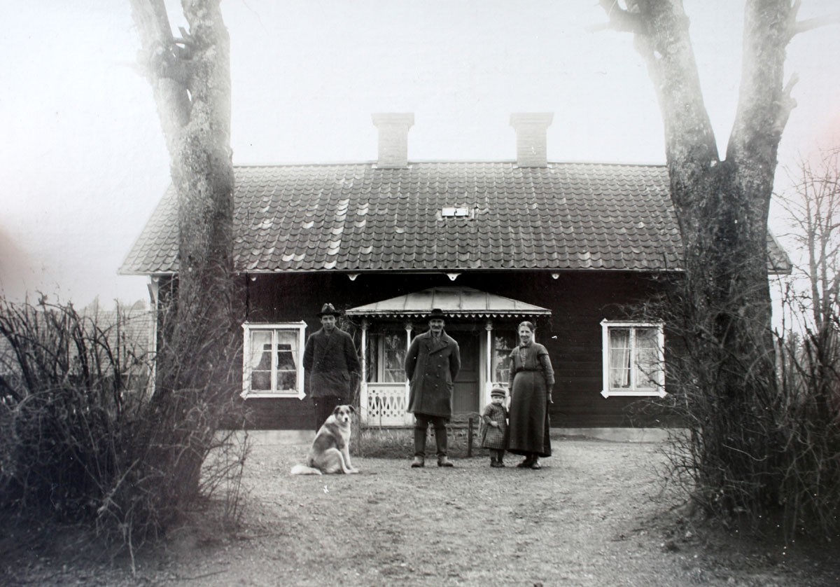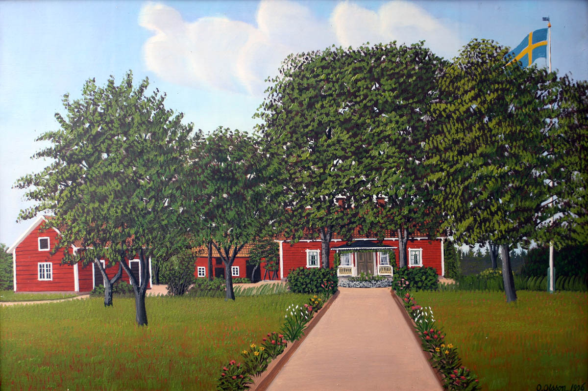 På målningen syns fr.v. ett sädesmagasin, ladugården och bostadshuset. Flaggstången har årtalet 1911. Idag är gården tillbyggd med en ny flygelbyggnad. Tillhörande fotografi är taget vid gården 1932 och personerna är fr.v.: fadern Henning, farfadern Johan Fredrik, ägaren, farmodern Anna Carolina Andersson samt hunden Key.